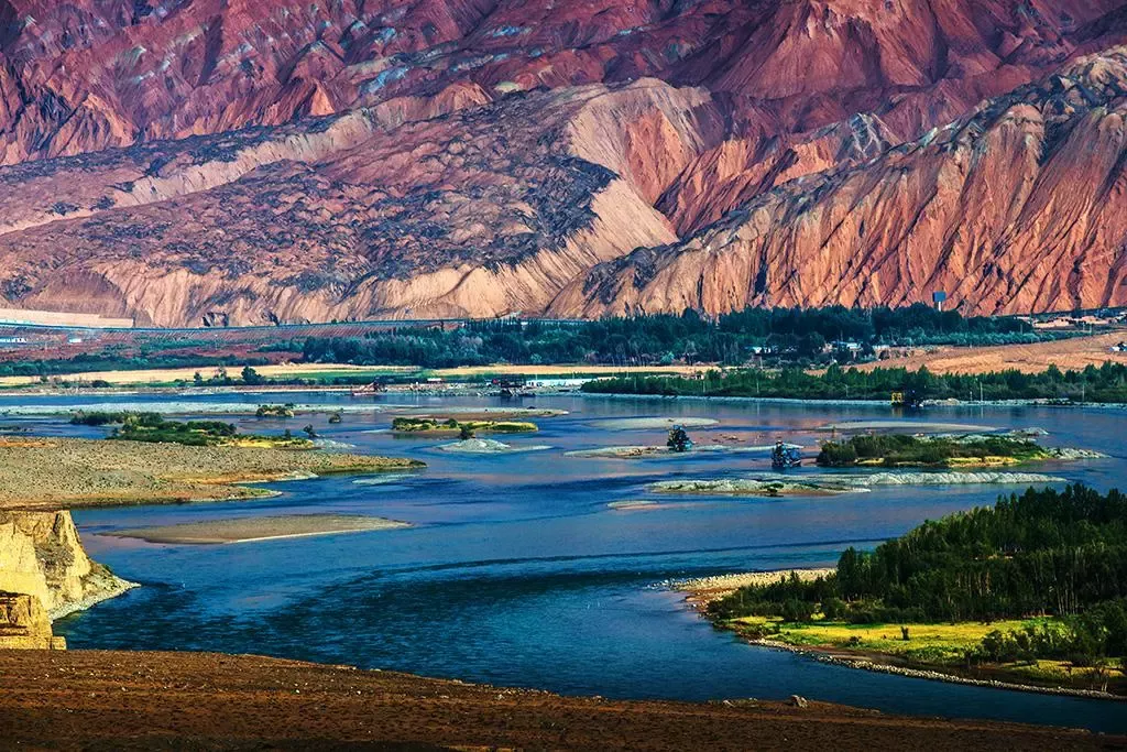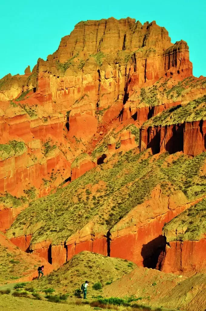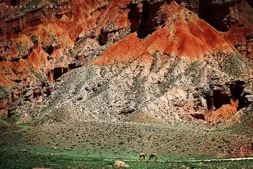 由于河水的切割,兩岸山巒多為斧劈刀削般的懸崖,加上一些風(fēng)蝕砂巖和較為平緩的山坡,重重疊疊,火紅火紅,綿延數(shù)十里,十分壯觀。