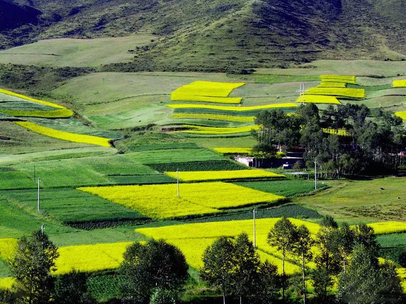 而到七月份,海拔3800多米的拉雞山上的油菜花盛開,黃綠色整齊相間,好一幅田園畫卷。