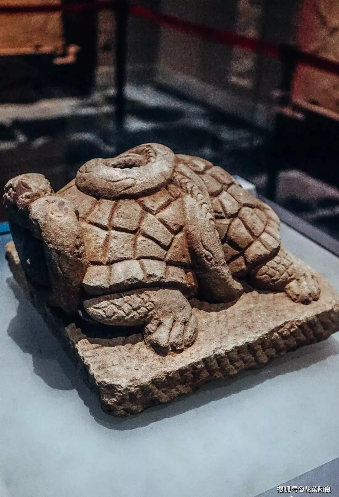 這個玄武石座,蛇身纏于龜背之上。在其上有洞口,據(jù)猜測,這很有可能是用來插經(jīng)幡,用以招魂之用。