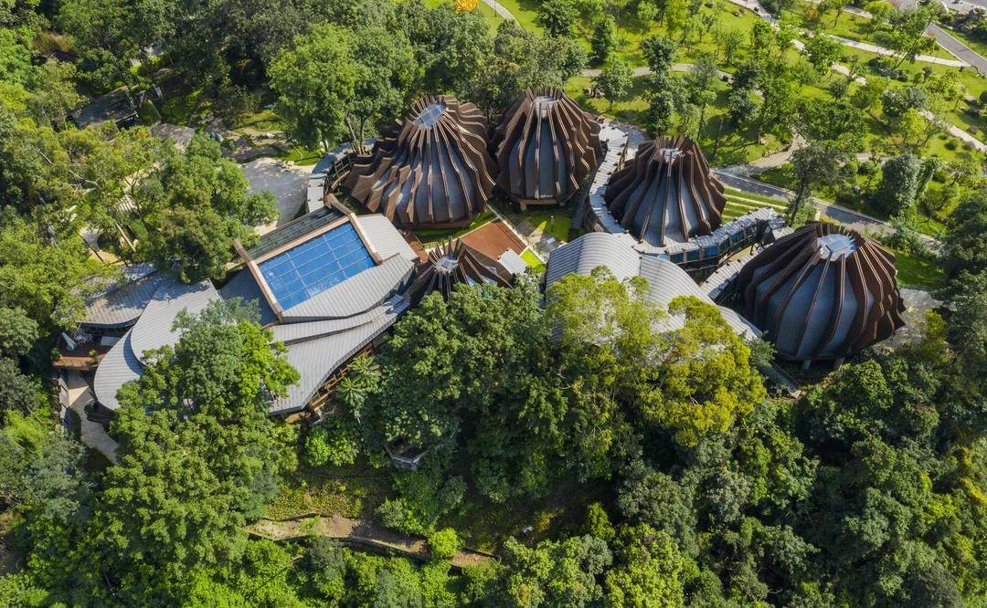 張大千博物館整體設(shè)計理念按照張大千在巴西八德園的設(shè)計為意象藍(lán)本,將博物館、美術(shù)館、園林藝術(shù)館三館合一,形成獨(dú)一無二的“館園一體”專題藝術(shù)博物館。同時,根據(jù)展陳需求,館內(nèi)還設(shè)置展廳及藏品庫房區(qū)、門廊、咖啡茶室、多功能廳及其他配套用房,打造由小體量建筑構(gòu)成的博物館聚落。結(jié)合景觀布局,形成“一湖兩山多組團(tuán)”的總體空間格局。