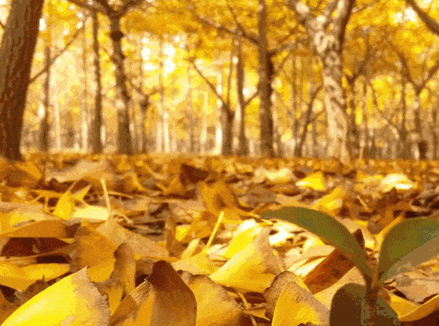 一整片的銀杏,黃葉繽紛, 整個(gè)天地都被渲染得一片金黃,地上也堆滿了金黃的葉子,秋風(fēng)吹過,紛紛灑灑, 像是童話的世界。