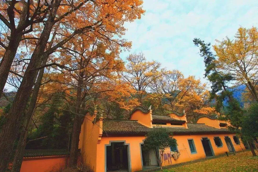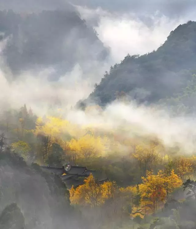 隱在金黃天地內(nèi)的各種建筑物,那粉墻黛瓦,在秋林中更顯精巧玲瓏。尤其是 寺廟的殿宇和亭臺(tái)樓閣更展其壯美,構(gòu)成了秋山蕭寺的美麗畫卷,一片安然恬靜之景。