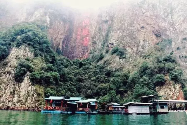 兩側(cè)的疊石巖, 壁立數(shù)十丈, 層層疊疊如彩屏,彎彎曲曲的 五泄湖, 猶似一條綠色的綢帶飄浮在群山之中,頗有富春山水的風(fēng)采。在游船中還可以觀賞許多奇特的山石景觀,夾巖洞為其中一景。